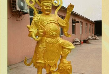 玻璃鋼四大天王雕塑在形體上以豐腴為美,人物肖像雕塑飾螺發,面龐及雕塑身圓潤渾厚。胸部可見肌肉凸起,天玻璃鋼雕像四大天王雕塑雕塑的肌肉感尤為突出。玻璃鋼四大天王雕塑以女性成熟豐盈的體態作為表現形式,多束高髻,上軀袒露,或斜披絡腋,下著羊腸大裙。從胸部至腰際形成突出的弧線,并配以像身的外輪廓和帔帛的曲線,構成造型上的三折枝式,這是玻璃鋼雕像四大天王雕塑最流行的樣式。